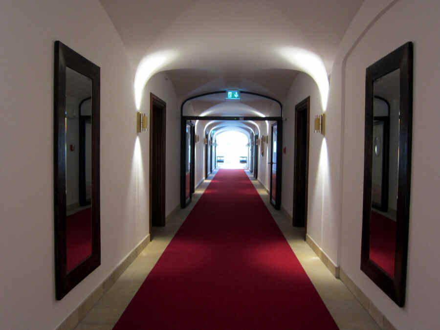Schloss Elmau ist ein Haus mit Tradition. Doch die Tradition erschlägt einen hier nicht, sie lastet nicht schwer in den Räumen. Im Gegenteil: Licht durchstahlt das historische Haus und sein Inneres strahlt Wärme zurück. Dies gelingt durch die asiatisch inspirierte Einrichtung und ihrer Leitfarbe, einem angenehmen, zum Orange tendierenden Rot-Ton. Eine zurückhaltende Eleganz bestimmt das Hotel-Interieur. Elegant, mit rotem Teppich, aber trotzdem schlicht sind die Flure gehalten. Gerade in den Hotelfluren lässt sich meiner Erfahrung nach der Geist eines Hotels erspüren.