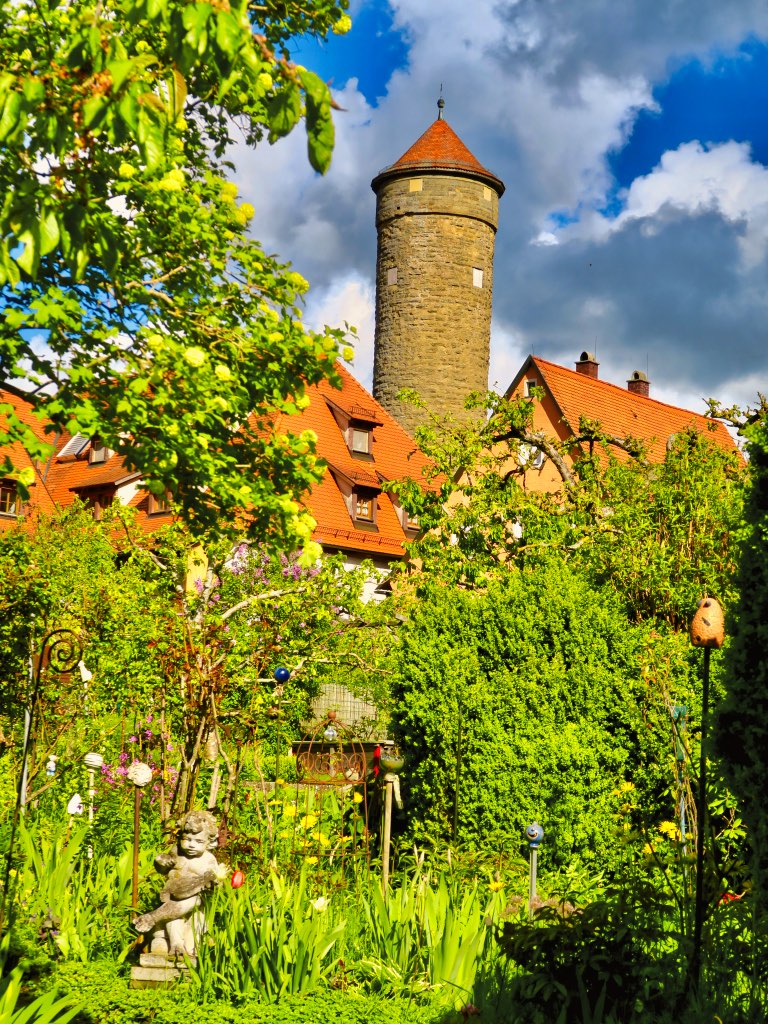 Weit in die Ferne geht der Ausblick vom Burggarten auf das grüne Taubertal. Vor lauter Gehölzen ist der Fluss Tauber fast nicht zu sehen. Dafür sticht das berühmte Topplerschlösschen ins Auge. Der mittelalterliche Wohnturm, der samt seinem historischen Mobiliar besichtigt werden kann, steht in einem wildromantischen Obstgarten. Noch ein Exemplar der Gärten in und um Rothenburg ob der Tauber.