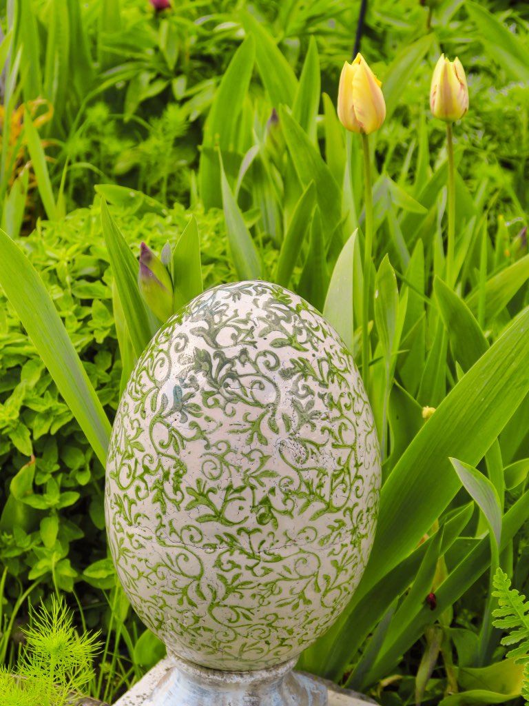Rosen, Iris und Pfingstrosen zählen zu ihren Lieblingsblumen. Dazwischen stehen Figuren zur Dekoration und Metallskulpturen. Hauptsache Vielfalt.
